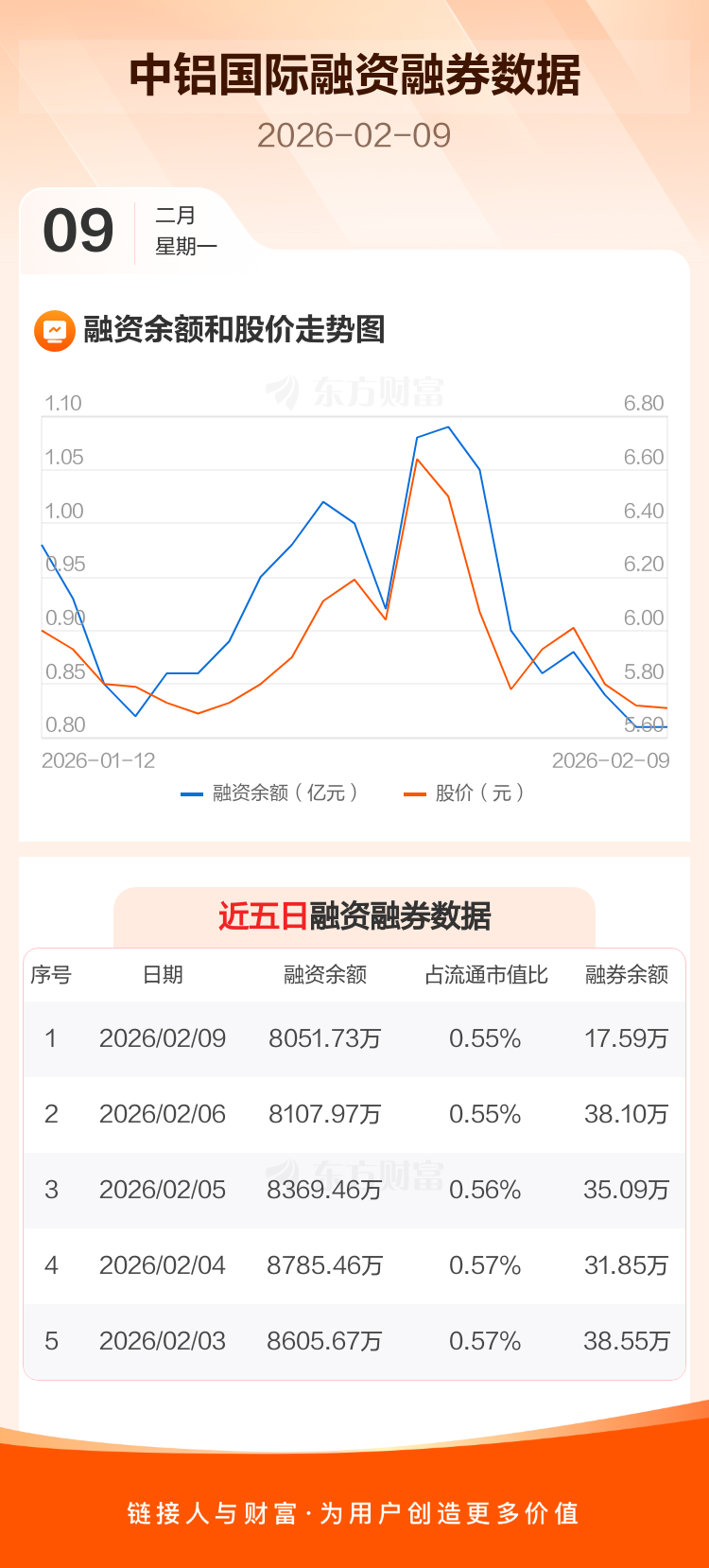 交易所最新数据显示,中铝国际于2026年2月9日获融资买入576.02万元,融资偿还632.27万元,当日融资净偿还56.25万元。目前,该股融资余额8051.73万,占流通市值比例为0.55%。