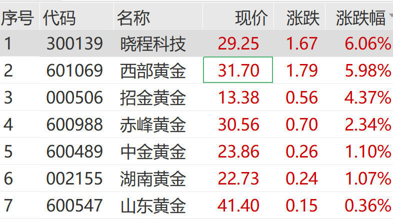 10月13日上午,A股黄金板块保持坚挺,晓程科技、西部黄金、招金黄金、赤峰黄金等个股逆市走强。