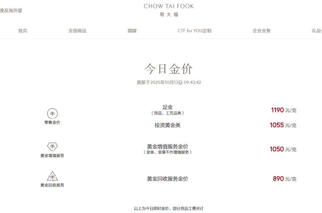 同时,国内主要品牌金饰价格水涨船高。截至发稿,周大福足金饰品价格报1190元/克,较上日大涨10元/克。