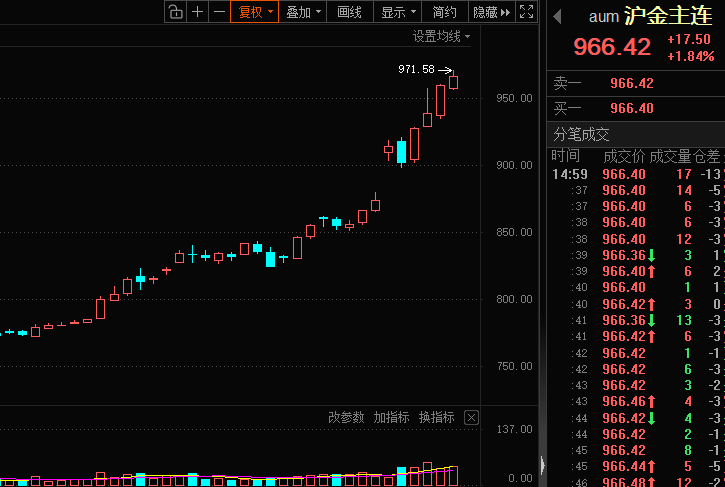 国内市场表现更为强劲,沪金期货主力合约价格创历史新高,盘中最高触及971.58元/克,涨幅一度高达2.39%,收盘涨1.84%。