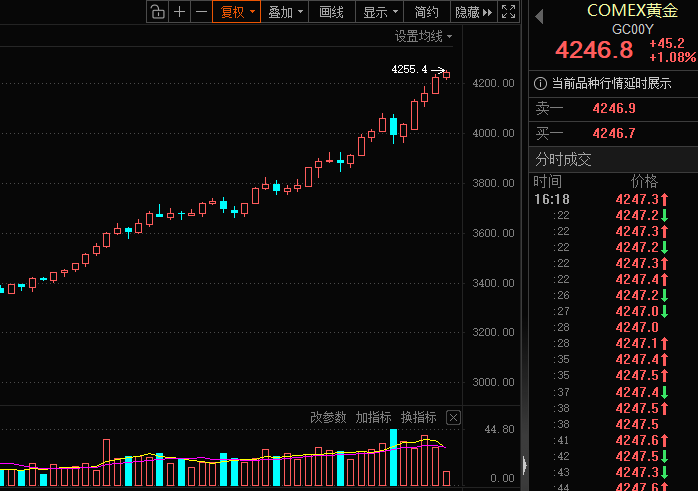 今日(10月16日),国际金价延续强势走势,实现第4个交易日创历史新高,COMEX黄金盘中最高触及4255.4美元/盎司。截至16时30分,COMEX黄金涨幅仍超1%。