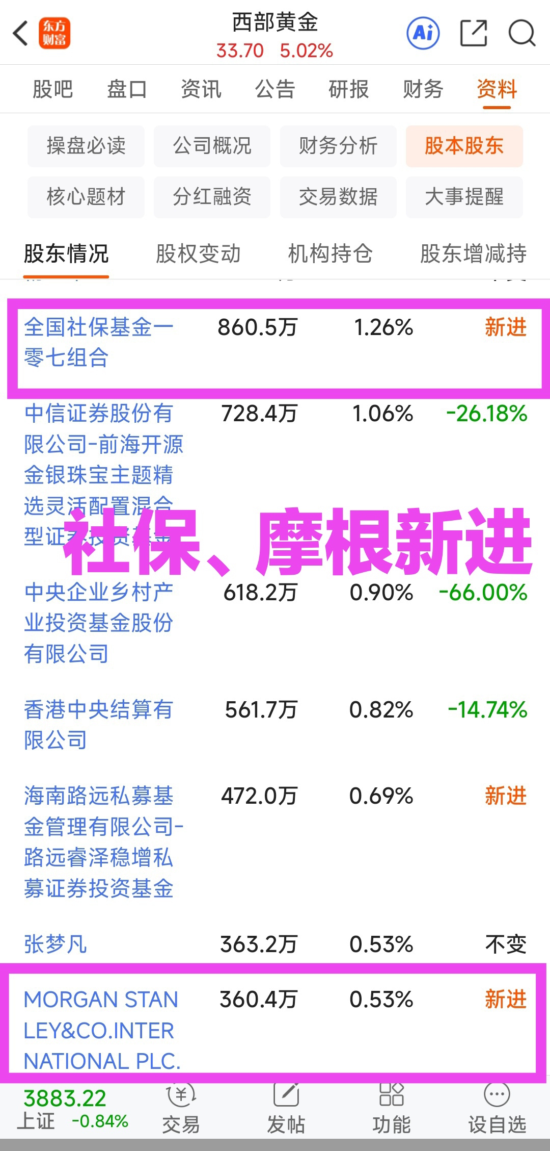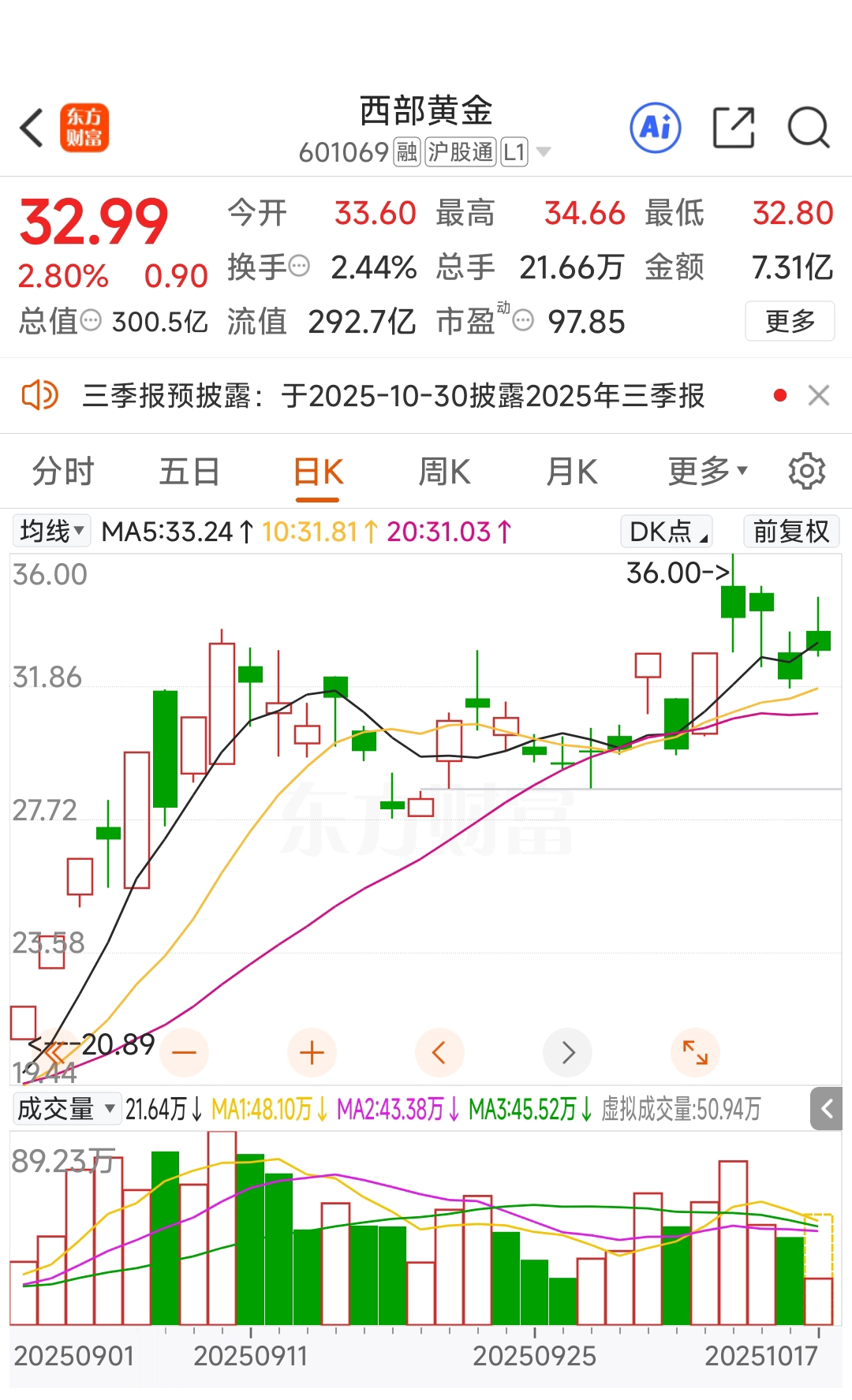 $西部黄金(SH601069)$ 黄金+铜锰铍+小金属+社保新进,突破整理平台,买入。2025中报增131.9%,美盛卡特巴阿苏金铜矿注入完成,金资源量比2024年增245%,金年产增超300%。预计2025-27每股收益0.56/1.4/2.16元