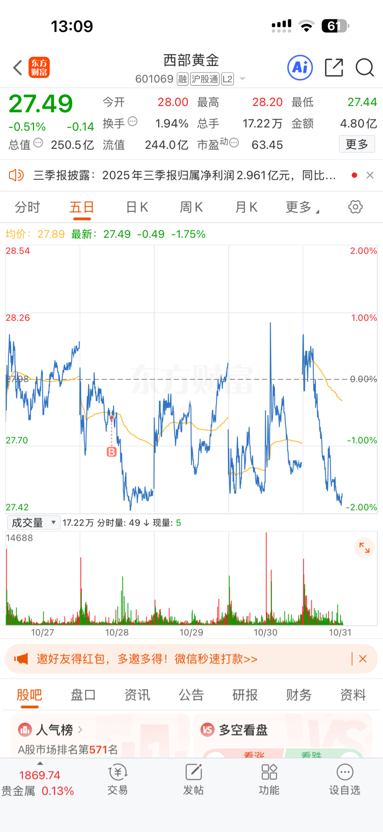 $西部黄金(SH601069)$ 这一天天的,波动很大啊