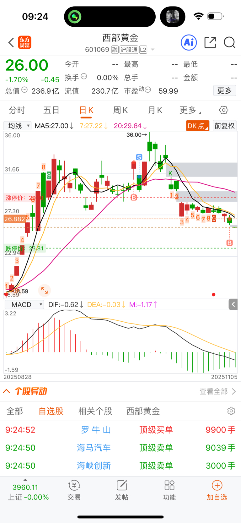 $西部黄金(SH601069)$ 下跌的杂毛股是真不能买,这股又让我亏1000多