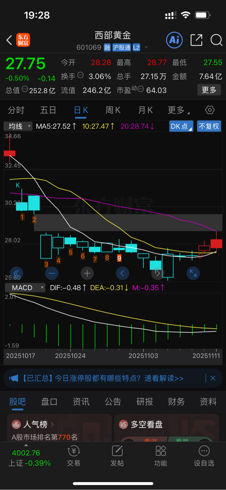 $西部黄金(SH601069)$ 根据我研究k线图的情景来说,多头占优趋势以现,今天回调一下,出掉之前底部盘整散户,12-14日看涨5-7个点,本周目标先上29.5元,是骡子是马拉出来给大家溜溜我的指标