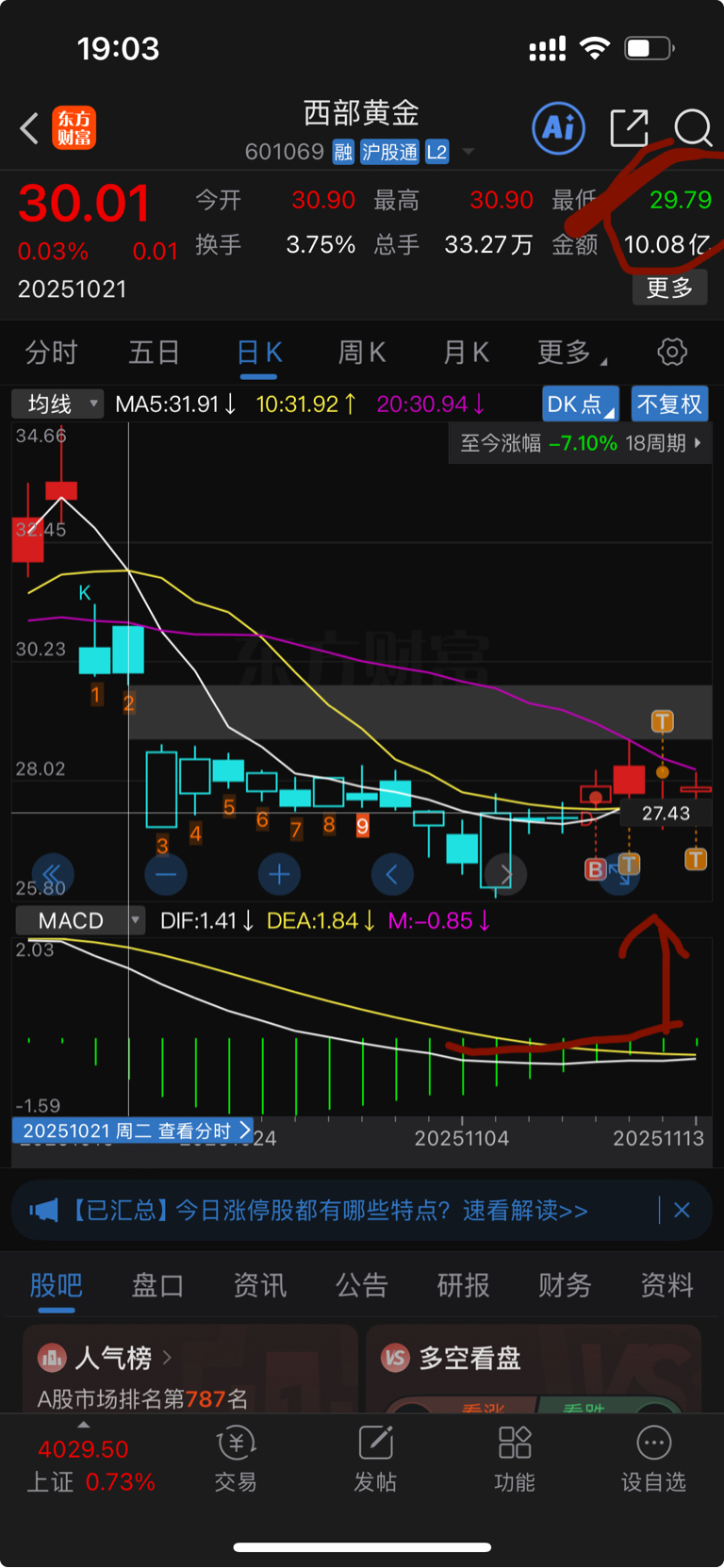 $西部黄金(SH601069)$ 这个标的从K线图上来看,不超过5个交易日即可触碰29.79这个位置,明天如果放量,先来一个到29的上影线看看,拭目以待(11.20日止)