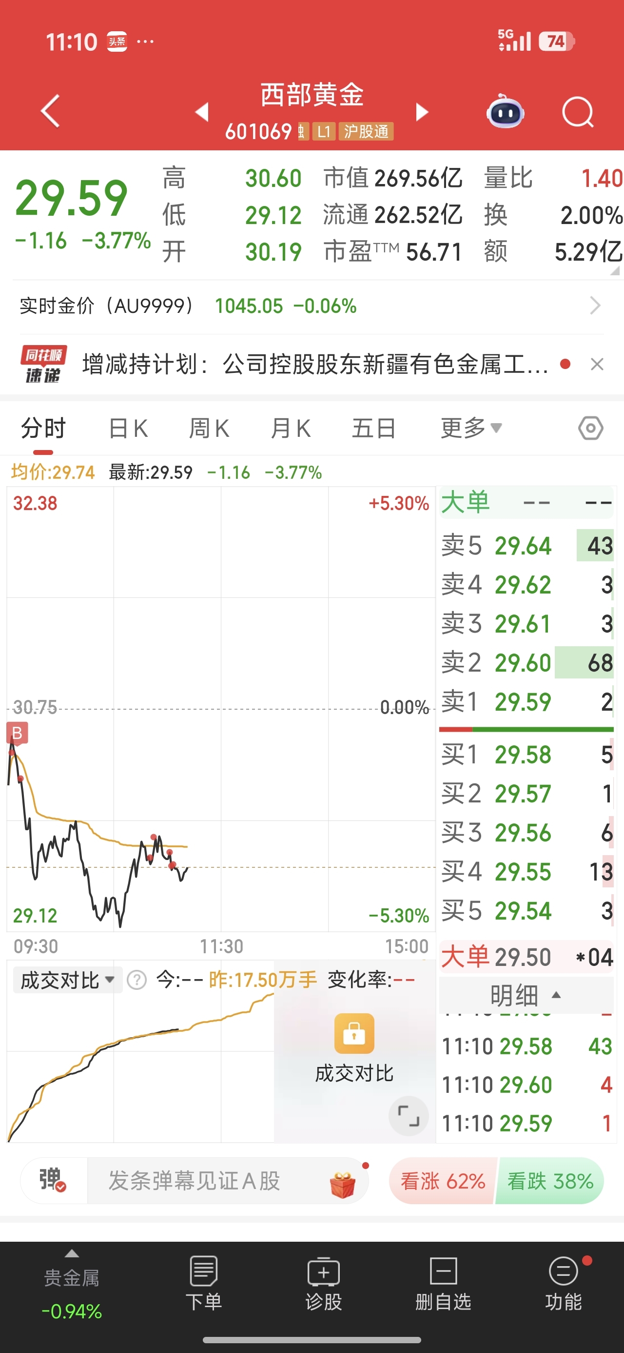 $西部黄金(SH601069)$ 早上也就这样了,老鼠认为一致行动人高持股比例下(68%)减持不是利空,增加市场流动性不见得是坏事