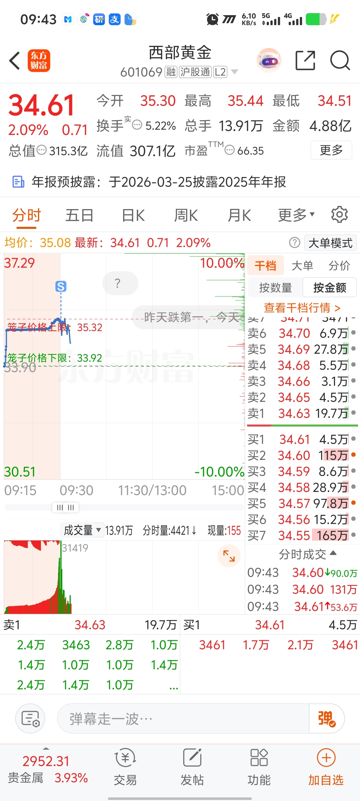 $西部黄金(SH601069)$ 还不走就得绿了,减持股昨天没看到,昨天都拍断大腿了,好在今天给机会了