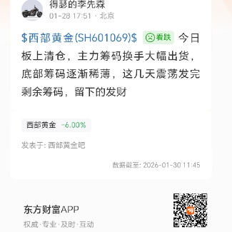 $西部黄金(SH601069)$  今日板上清仓,主力筹码换手大幅出货,底部筹码逐渐稀薄,这几天震荡发完剩余筹码,留下的发财