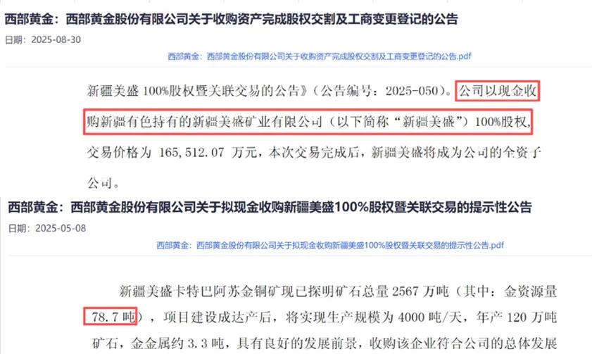 如果说湖南白银只能在窄巷里辗转腾挪,那西部黄金则完全是在自家矿脉上稳扎稳打,而它的底气,来自实实在在的黄金储量。2025年8月,公司完成对新疆美盛矿业的全资收购,新增了78.7吨黄金资源量,资源版图实现质的飞跃。这笔交易自三季报起并表,公司总资产直接从91.30亿攀升至144.48亿,堪称一次战略跃迁。