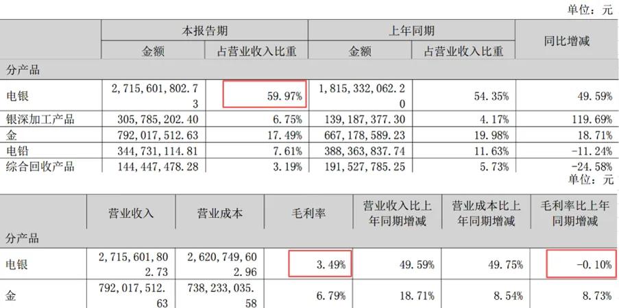 湖南白银的运作方式则大相径庭,它的主业不是拥有银,而是处理银。公司近六成营收来自电银销售,但毛利率常年徘徊在3%至5%区间。原因其实很简单,大部分原料靠外购,自己只赚加工费。它的角色,更像是贵金属产业链里的“精炼工坊”,客户送来含银废料或粗矿,它负责提纯成高纯银,再交付给电子、光伏或饰品厂商。而金属价格的涨跌,基本与其无关,它只赚技术活的钱。