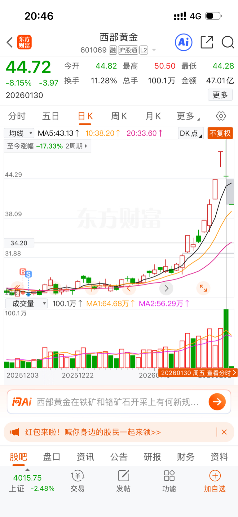 $西部黄金(SH601069)$ 50块进的兄弟们你们还好吗,明天天就不是地板了,最不济也是低开1个点哈哈