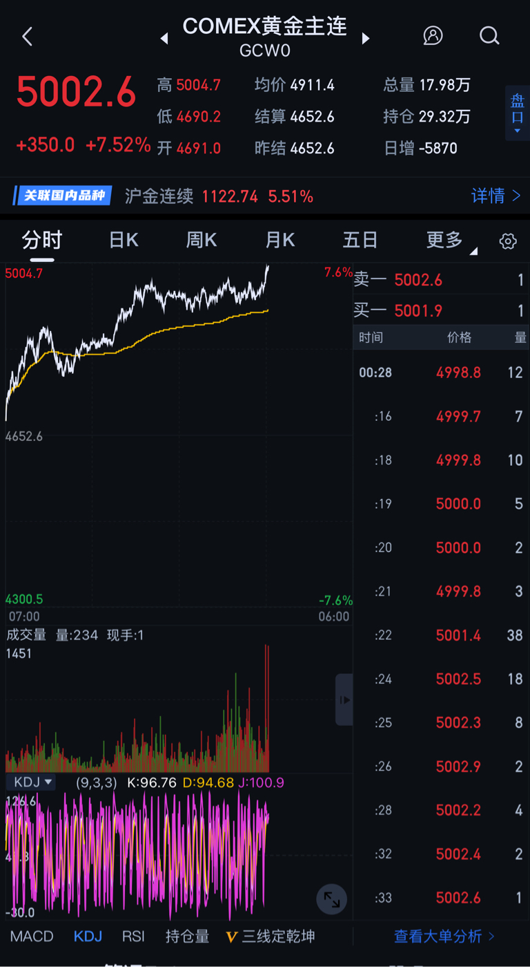 黄金暴涨7.6%、已经冲上5000美元了!第二波三连板起飞!