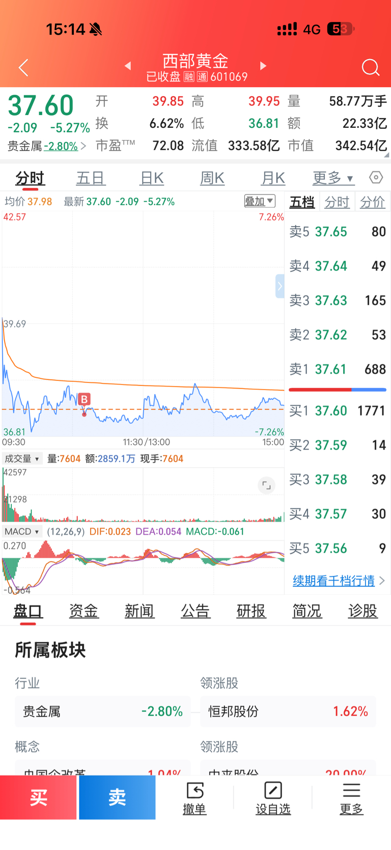 $西部黄金(SH601069)$ 抄了个底,不知真底假底。