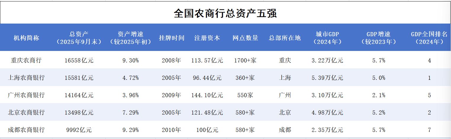 从区域布局看,这些农商行主要展业地分别集中在北京、上海、广州、重庆及成都。2024年,这五座城市的GDP(地区生产总值)均位列全国城市前七强,经济总量合计约19万亿元,占全国经济总量的比重超过14%。