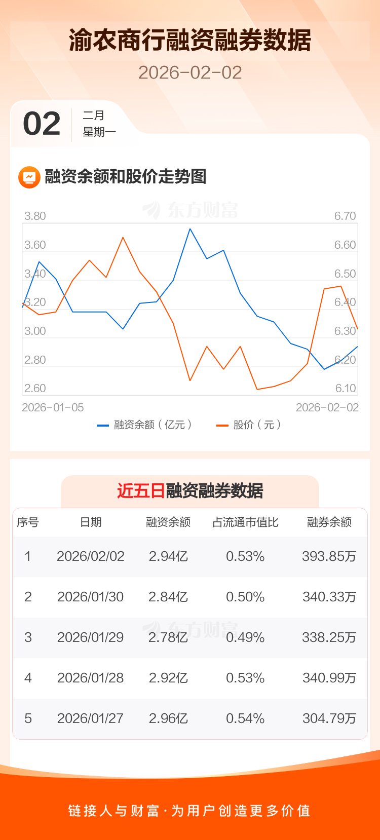 交易所最新数据显示,渝农商行于2026年2月2日获融资买入3336.34万元,融资偿还2293.07万元,当日融资净买入1043.27万元。目前,该股融资余额2.94亿,占流通市值比例为0.53%。