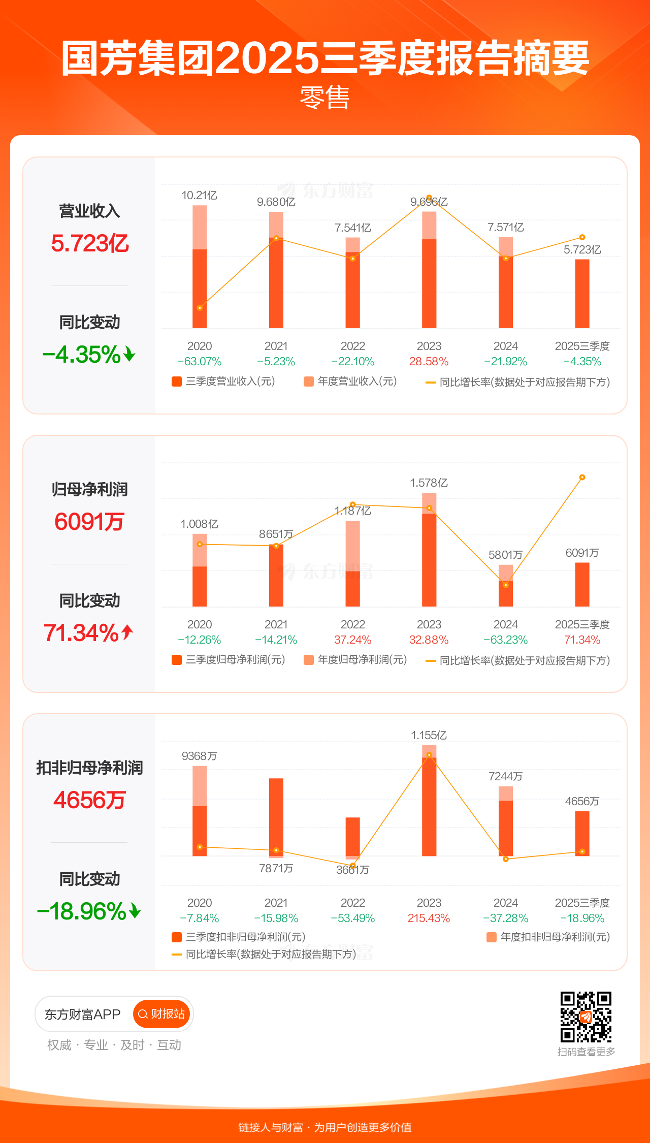 国芳集团10月31日发布2025年三季报显示,公司前三季实现营业收入5.72亿元,同比下滑4.35%;归母净利润6091.32万元,同比增长71.34%;扣非归母净利润4656.22万元,同比下滑18.96%。
