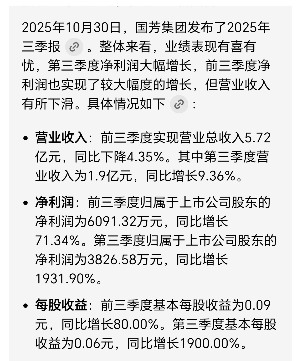 国芳三季报业绩有点吓人呐,增长大超预期,今天下午刚卖,我是不是就没有这赚钱的命啊