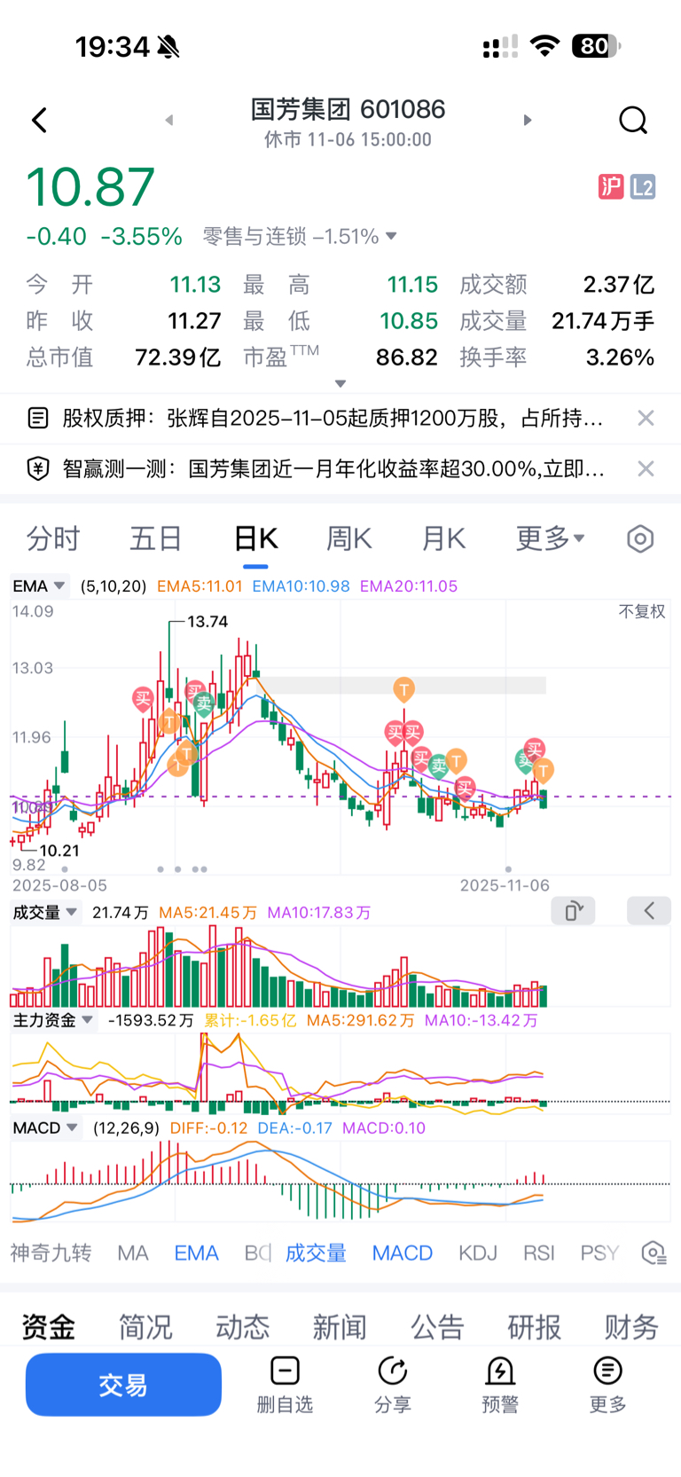 $国芳集团(SH601086)$ 这股尿性 每天必低开 没办法做了个反T 这个缺口大A规矩肯定补 就看你耗得起吗