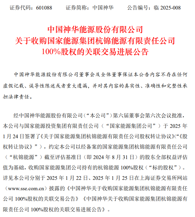 中国神华公告,公司于2025年2月11日完成向国家能源集团公司支付本次收购对价8.53亿元。根据《股权转让协议》的约定,自上述支付收购对价之日起,公司成为国家能源集团杭锦能源有限责任公司100%股权的所有权人、享有相应的股东权利并承担股东义务,国家能源集团公司对标的股权不再享有任何权利。