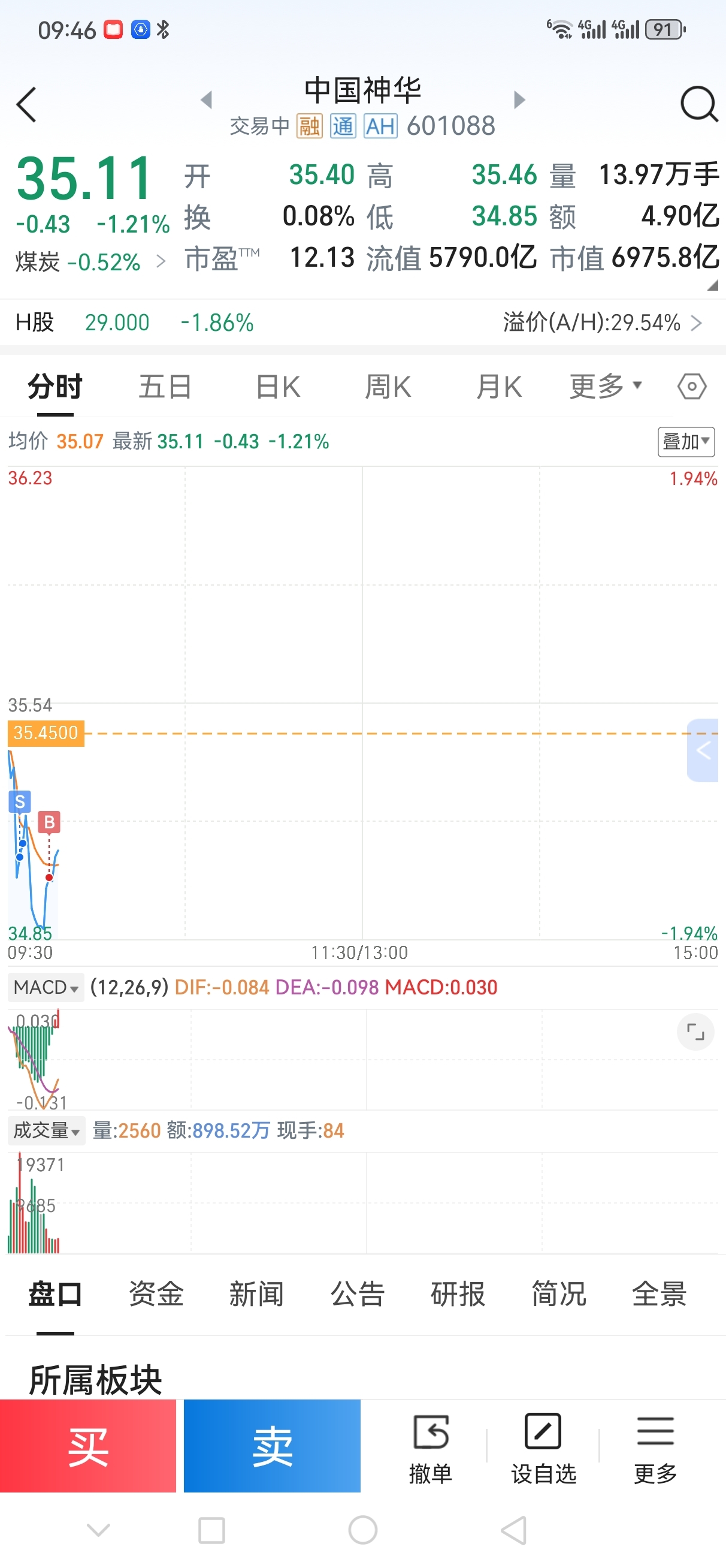 $中国神华(SH601088)$ 今天t了一毛三,三分钱佣金税费,挣一毛钱。成本来到了38.689。今天反思,今天贪心了。想t一个三毛三,在能t三毛钱的时候,没有t,一下子就过了我的买点,反应不过来,匆匆买入。对于卖点,一开盘就出现了,就是开盘线和量我看不清,今天卖点算是对的。今天任务算是完成每天t六分钱到三毛三。