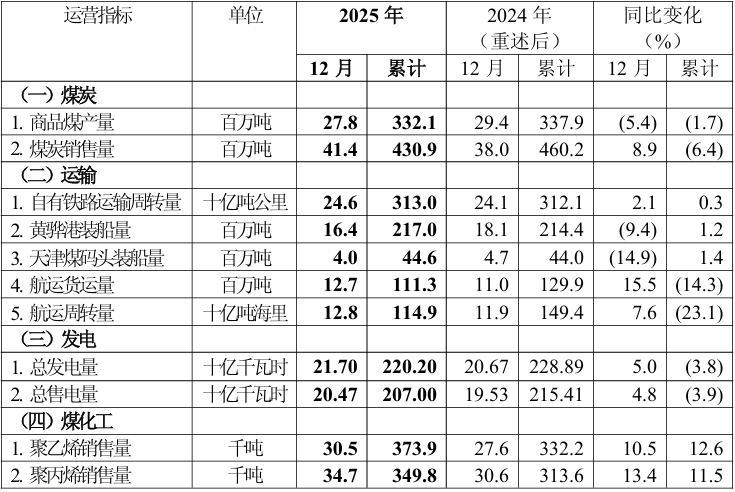 1月16日,中国神华(601088/01088)发布公告,公布2025年12月份主要运营数据。