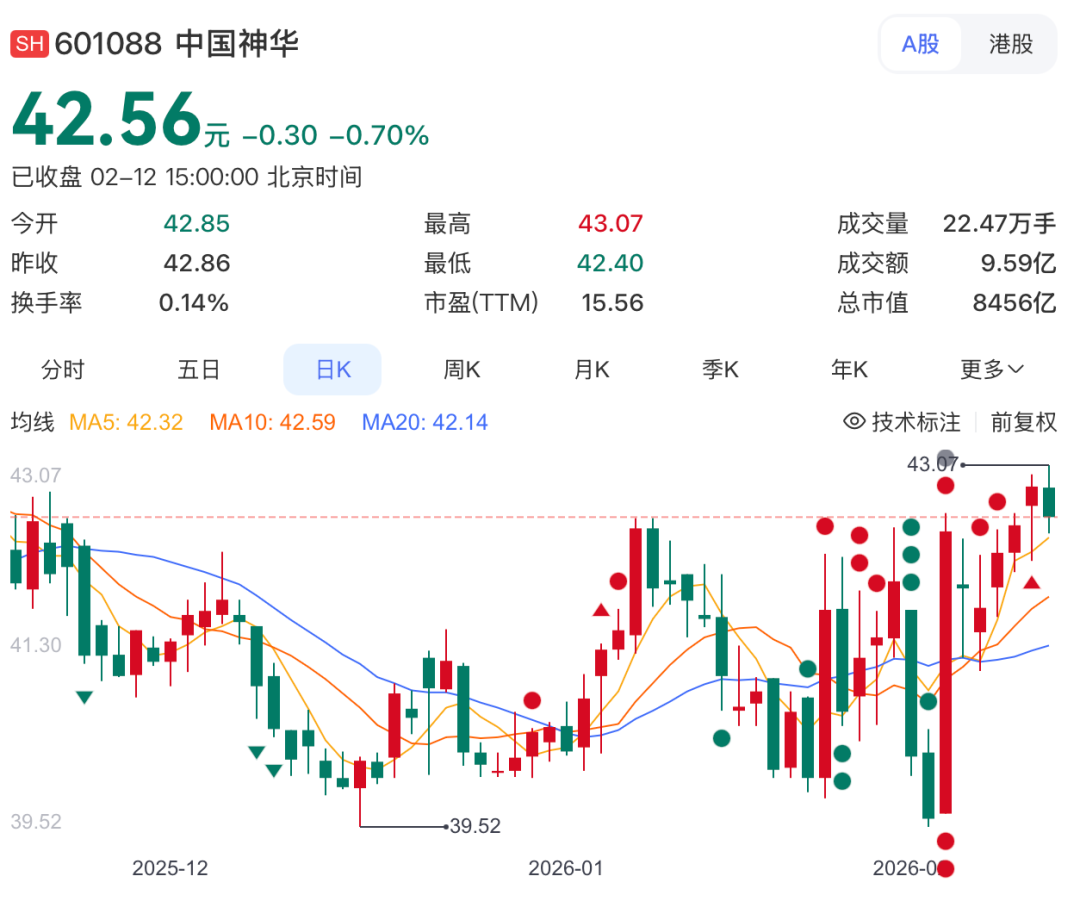 中国神华是全球领先的以煤炭开采为基础的一体化综合能源企业,主营业务覆盖煤炭产销、电力、铁路运输、港口、航运和煤化工等全产业链。截至2月12日收盘,中国神华每股报42.56元,最新市值为8456亿元。