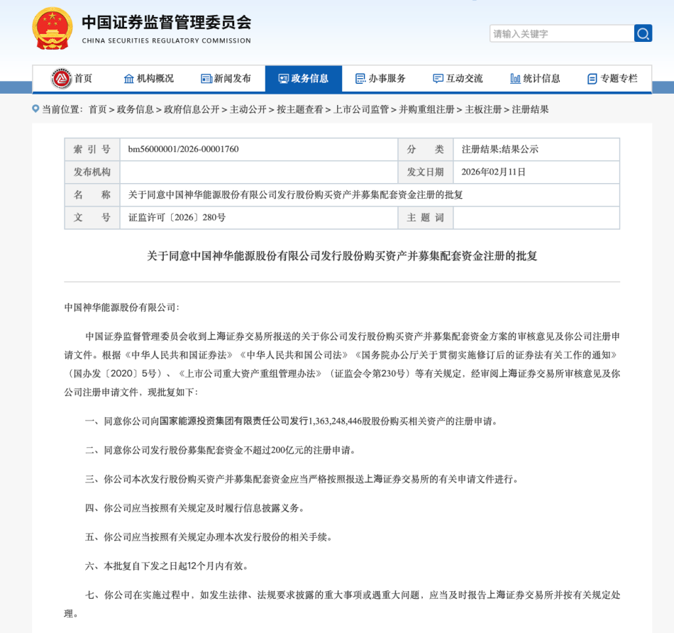 2月12日,证监会官网显示,中国神华发行股份购买资产并募集配套资金方案已获注册批复。
