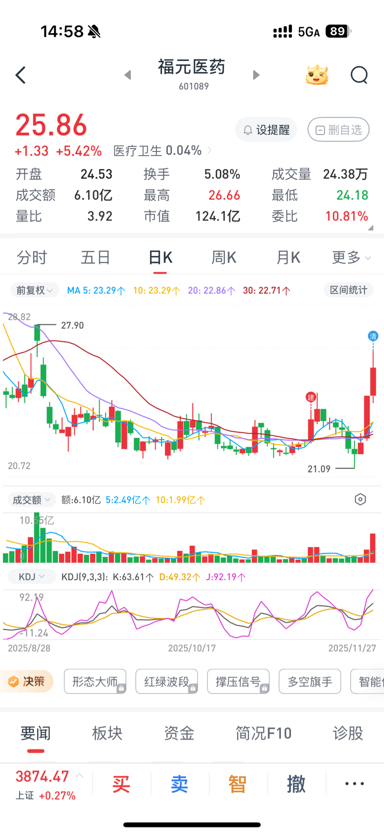 $福元医药(SH601089)$ 这次买的不多哦,6个点已出,大盘还是很弱哦,轻仓吧,目前就剩【浙江自然】了。