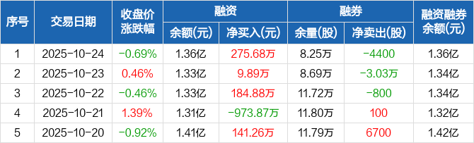 融资方面,当日融资买入829.69万元,融资偿还554.02万元,融资净买入275.68万元,连续3日净买入累计470.44万元。融券方面,融券卖出0股,融券偿还4400股,融券余量8.25万股,融券余额35.81万元。融资融券余额合计1.36亿元。