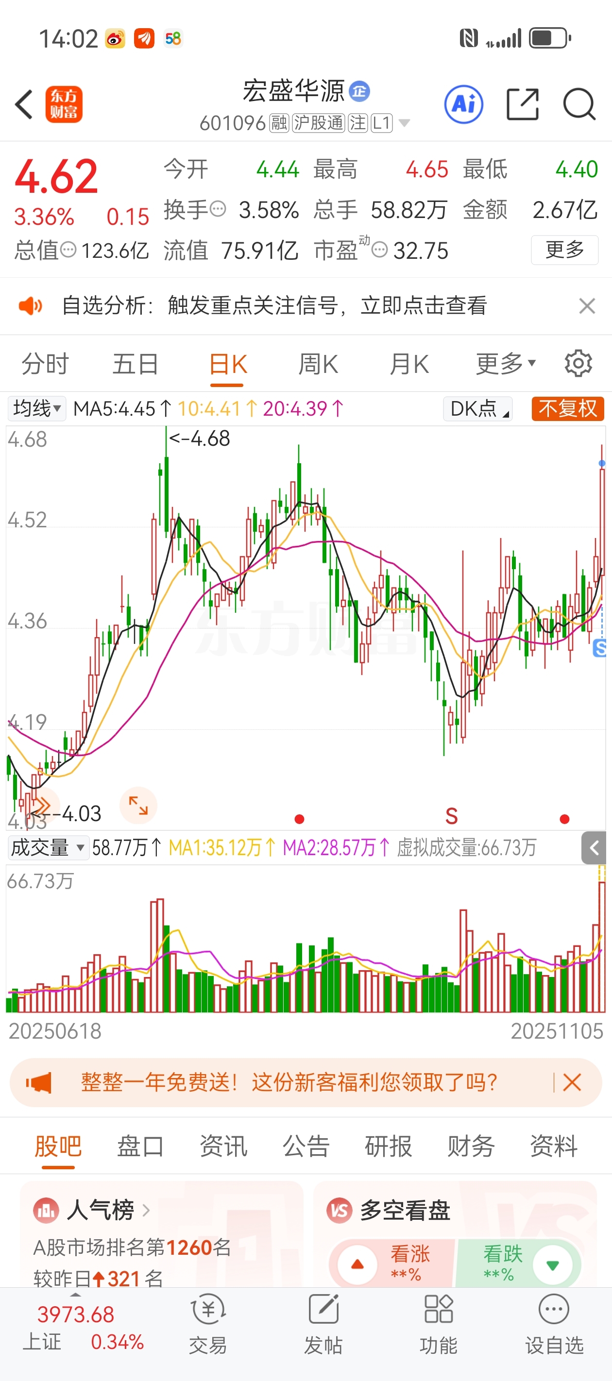 $宏盛华源(SH601096)$ 熬不住了,先走为上