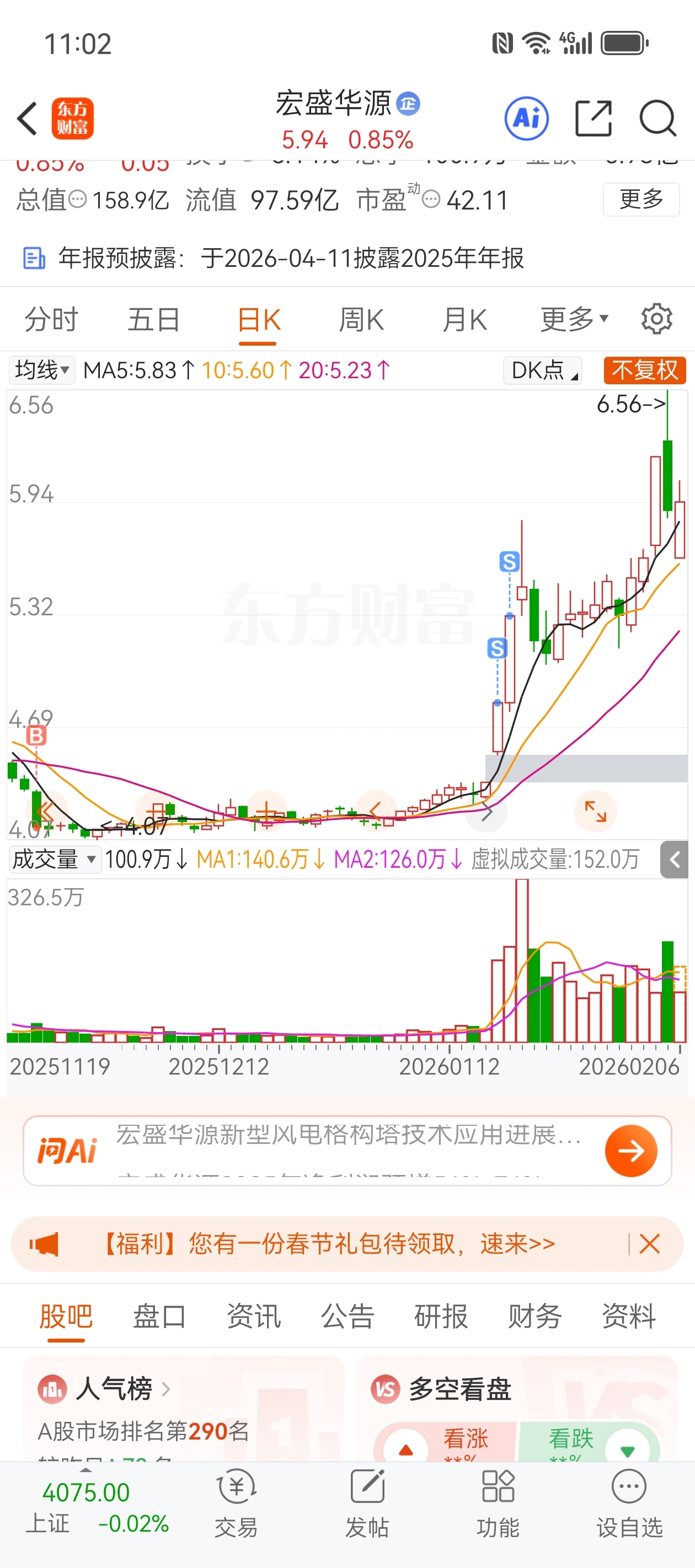 $宏盛华源(SH601096)$ 不到4块坚决不买
