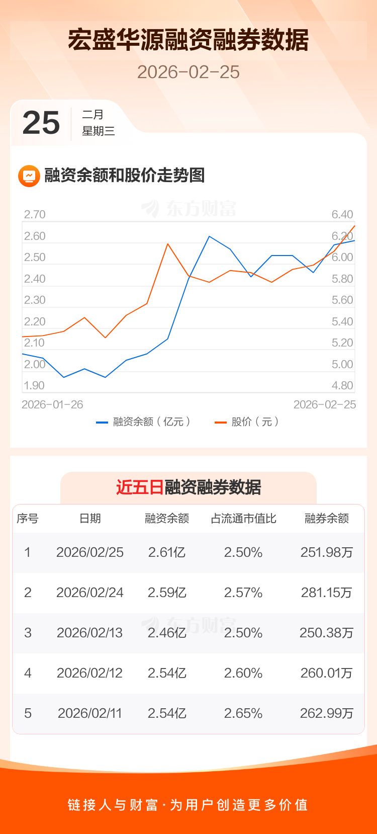 交易所最新数据显示,宏盛华源于2026年2月25日获融资买入5706.39万元,融资偿还5492.56万元,当日融资净买入213.83万元。目前,该股融资余额2.61亿,占流通市值比例为2.50%。