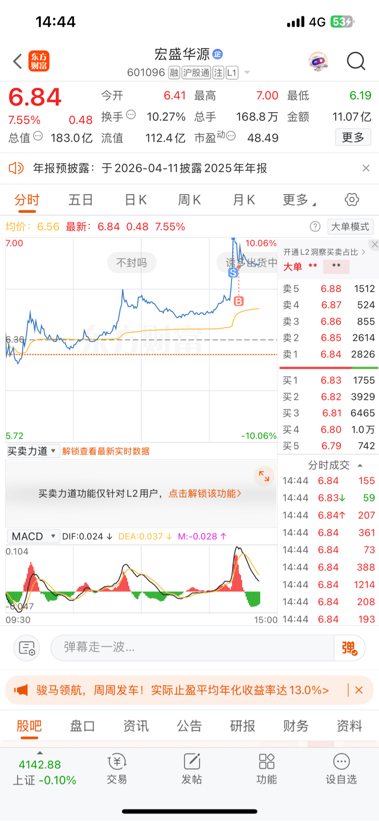 $宏盛华源(SH601096)$ 回封就更好,不封收盘有8个点也可以,明天走一个加速,顶一字板或者开盘就封板
