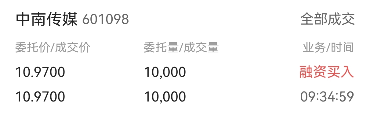 $中南传媒(SH601098)$ 买入,10.97元,买入一万股。