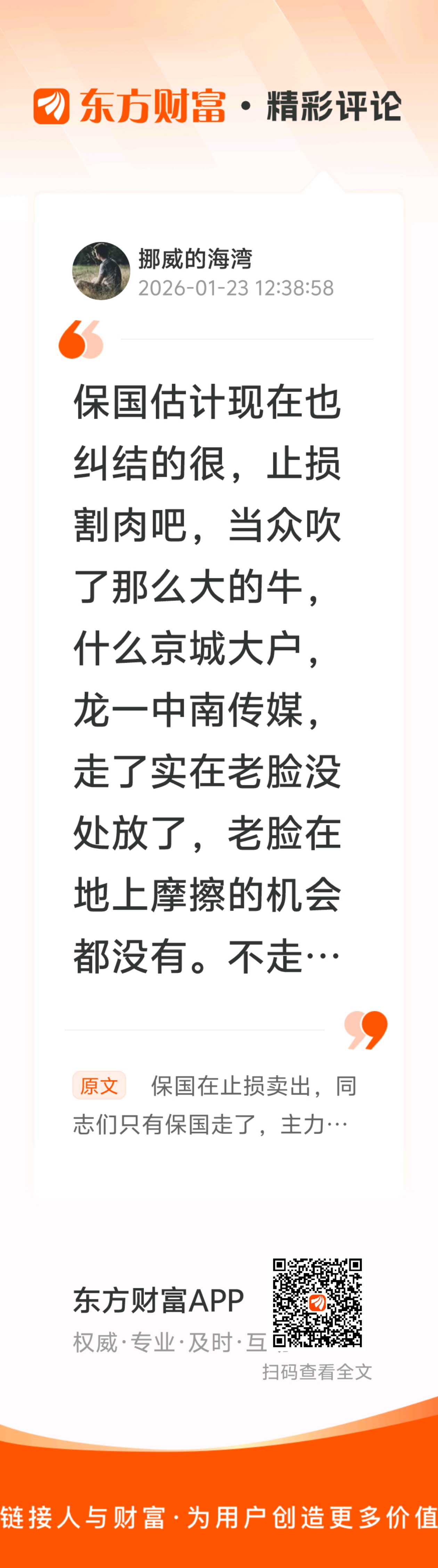 你说的非常对//@挪威的海湾 :保国估计现在也纠结的很,止损割肉吧,当众吹了那么大的牛,什么京城大户,龙一中南传媒,走了实在老脸没处放了,老脸在地上摩擦的机会都没有。不走吧,被主力狙击,套的他死去活来的,他也知道,只要他在主力是不会拉的,保国原本想,等粉丝来接盘,他趁机出货,没聊到,中南主力的狙击就是这样精准,准确打击了保国的七寸