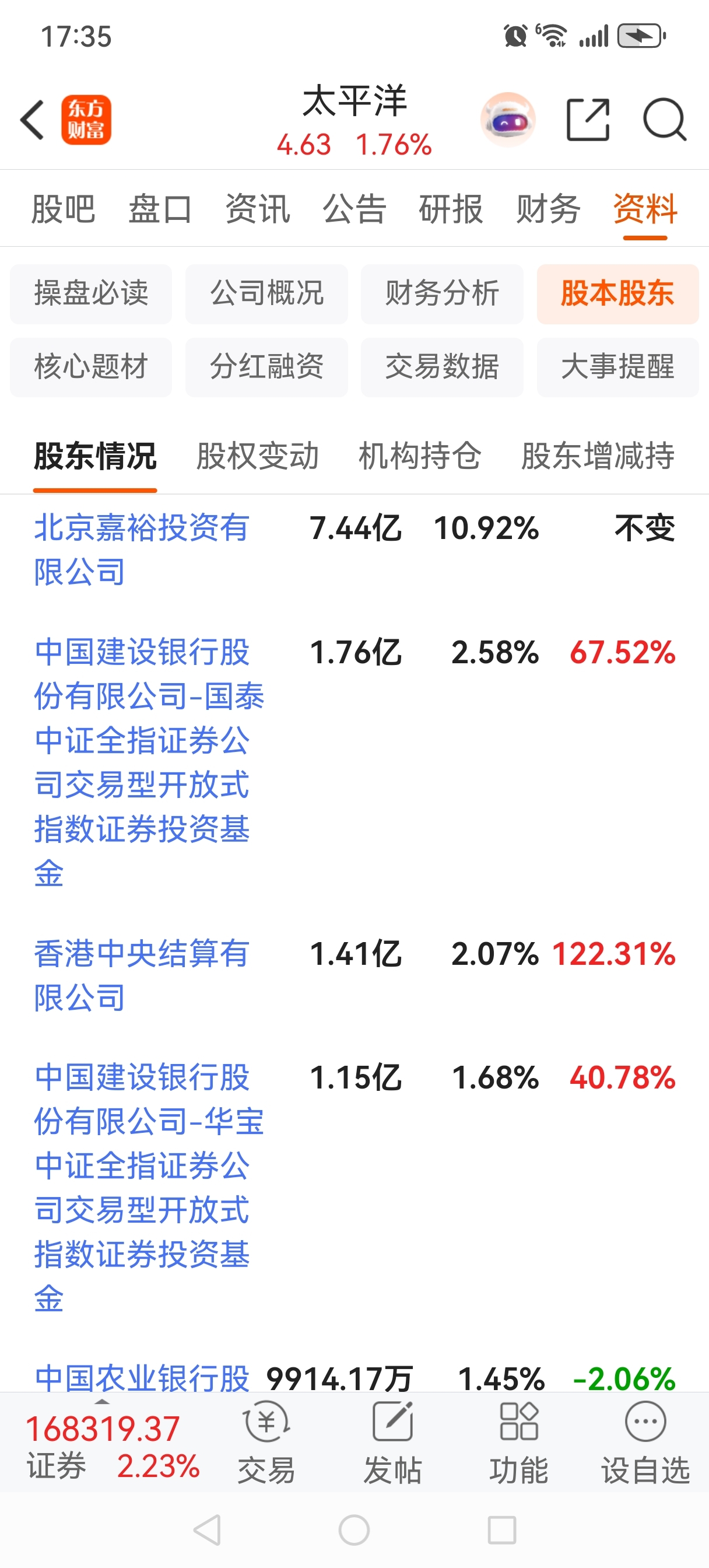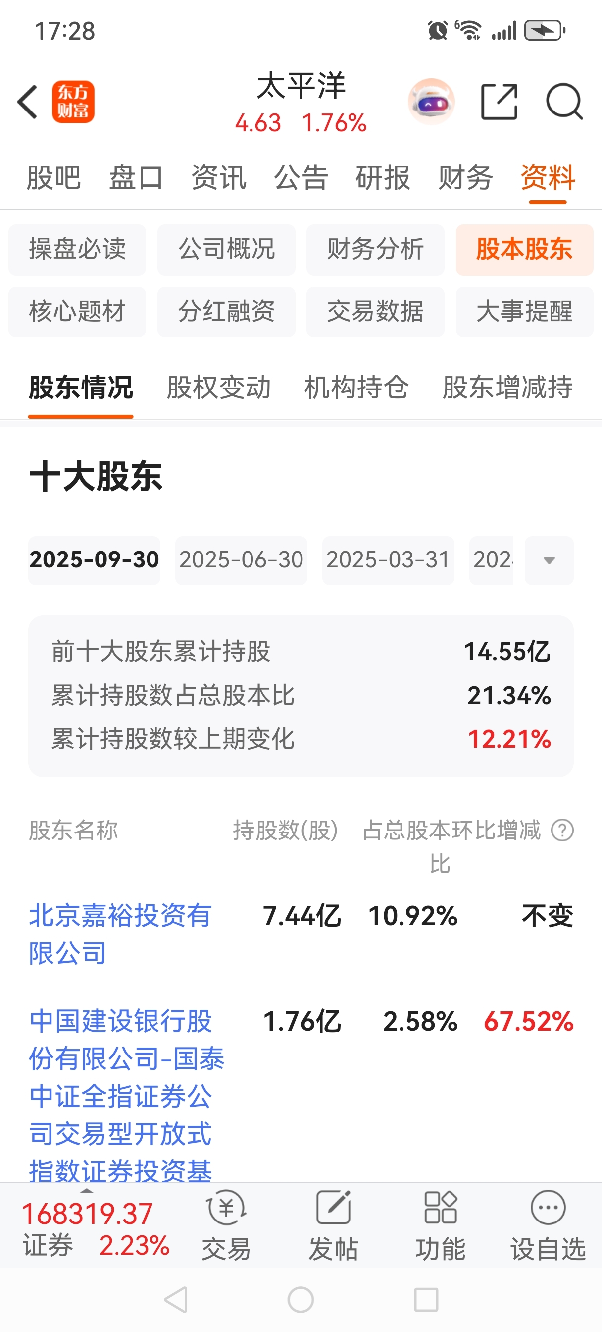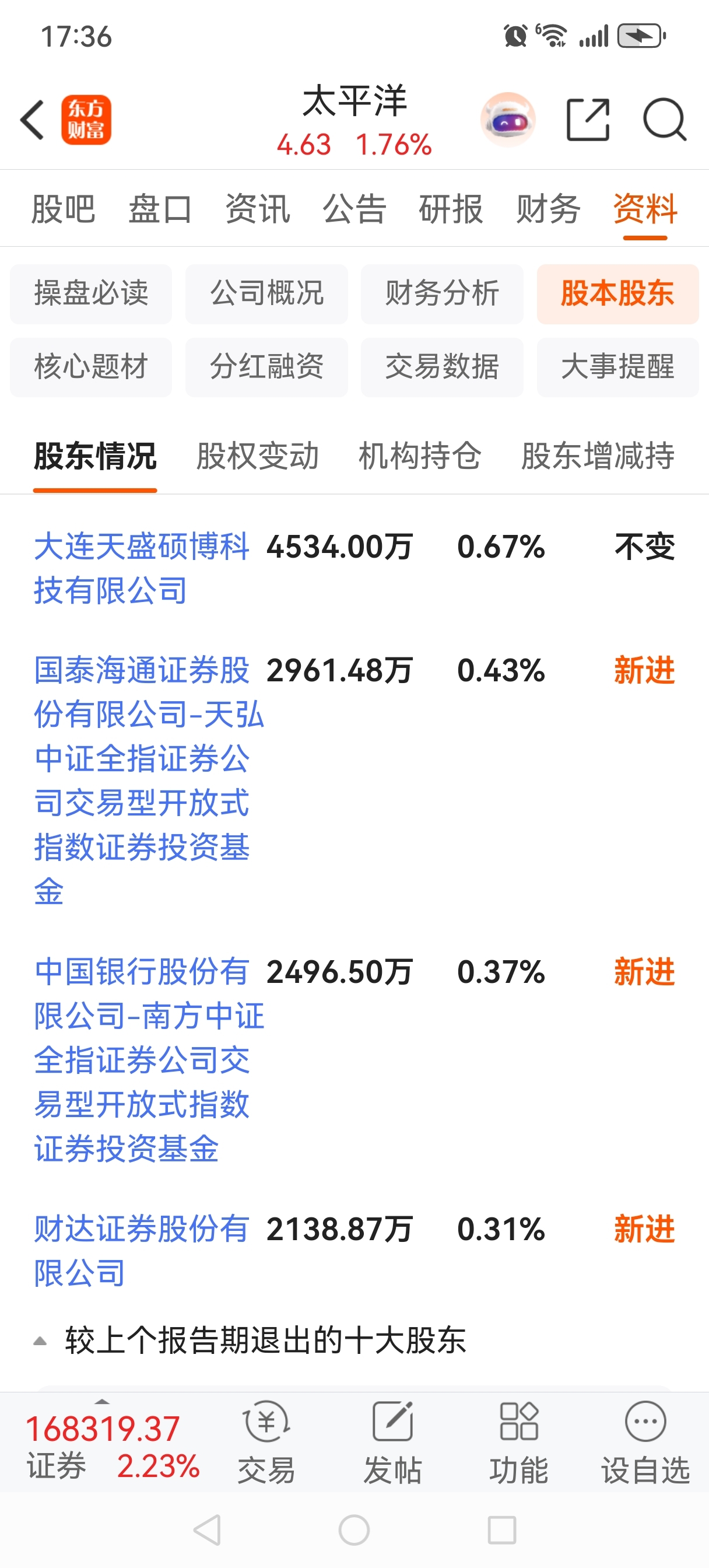 $太平洋(SH601099)$ 前十大股东持股占比增加了12%,我认为这是一个利好,筹码集中度上涨是好事。虽然高盛国际走了,但是银行系的指数基金,券商系的指数基金,券商自营等都加仓了,相信专业的机构比我们散户更明白太平洋这支票是不是值得拥有。
