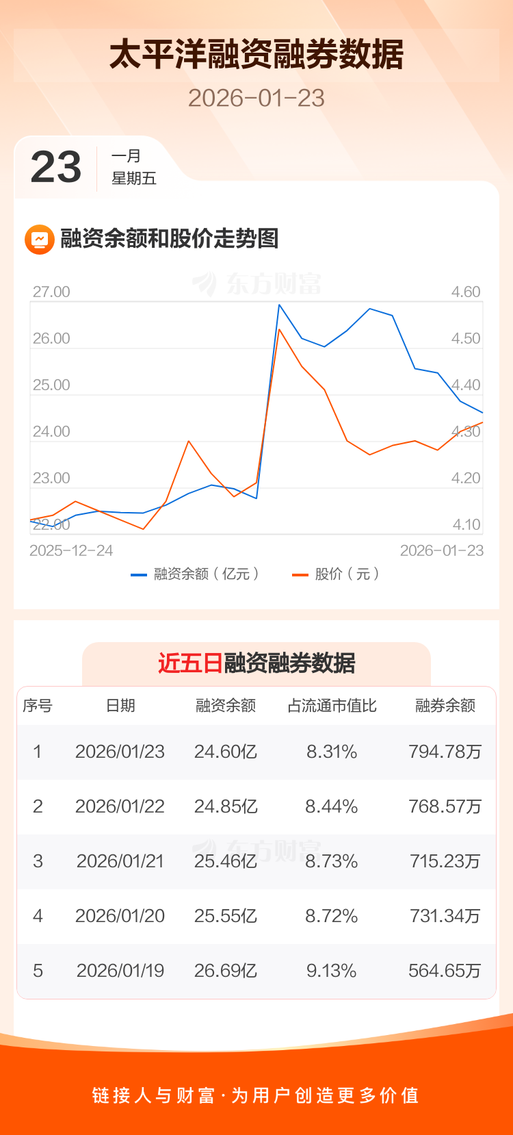交易所最新数据显示,太平洋于2026年1月23日获融资买入7887.19万元,融资偿还1.04亿元,当日融资净偿还2505.64万元。目前,该股融资余额24.60亿,占流通市值比例为8.31%。