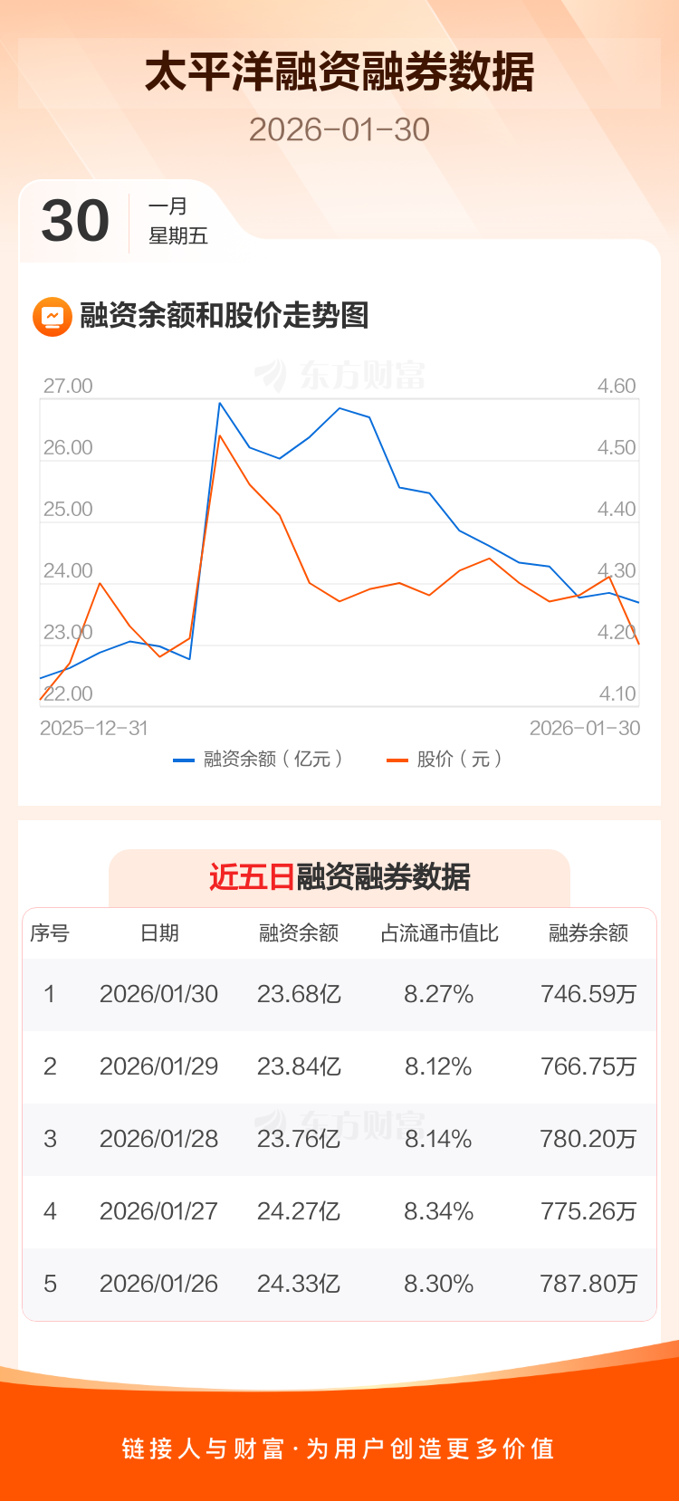 交易所最新数据显示,太平洋于2026年1月30日获融资买入1.02亿元,融资偿还1.18亿元,当日融资净偿还1576.31万元。目前,该股融资余额23.68亿,占流通市值比例为8.27%。