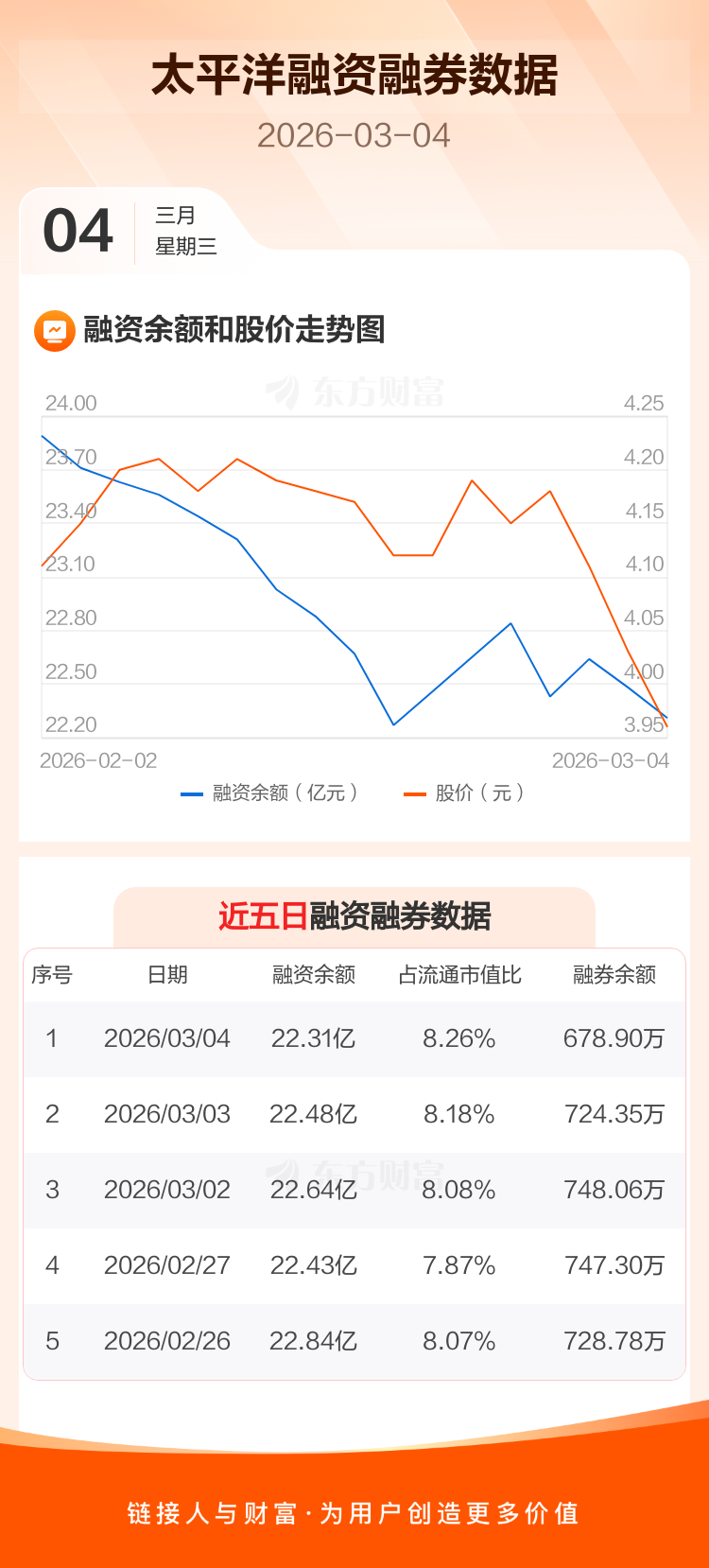 交易所最新数据显示,太平洋于2026年3月4日获融资买入4466.31万元,融资偿还6183.17万元,当日融资净偿还1716.86万元。目前,该股融资余额22.31亿,占流通市值比例为8.26%。