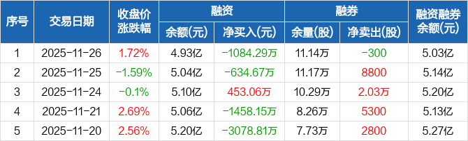 恒立液压:融资净偿还1084.29万元,融资余额4.93亿元(11-26)