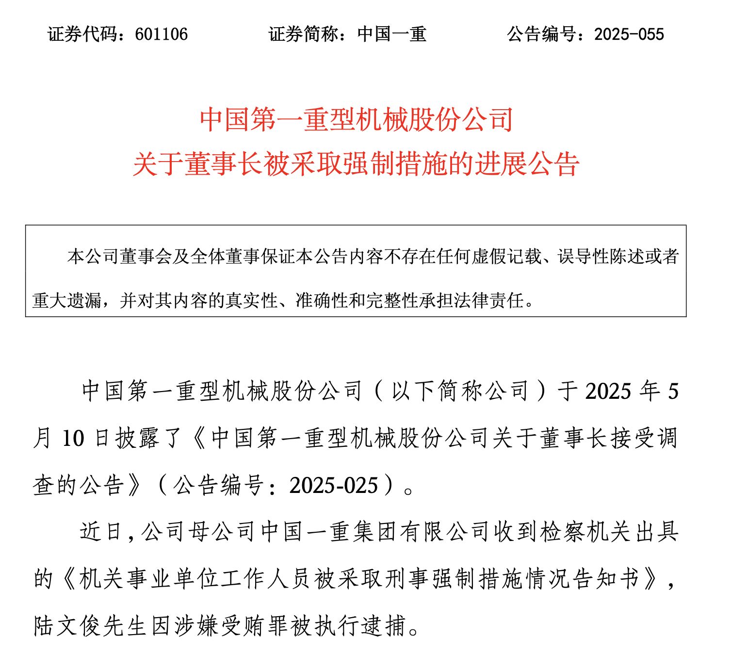 11月18日晚,中国一重(601106.SH)公告,此前披露,公司法定代表人、董事长、党委书记陆文俊涉嫌严重违纪违法,接受中央纪委国家监委纪律审查和监察调查。公司母公司中国一重集团有限公司近日收到检察机关出具的《机关事业单位工作人员被采取刑事强制措施情况告知书》,陆文俊因涉嫌受贿罪被执行逮捕。目前公司生产经营正常,董事长及公司法定代表人职责由董事张文平代行,日常经营管理由高管团队负责。