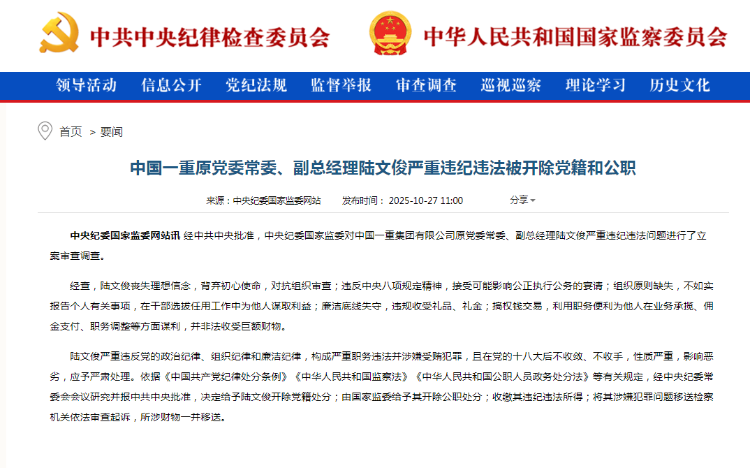 此前,据10月27日中央纪委国家监委网站消息:经中共中央批准,中央纪委国家监委对中国一重集团有限公司原党委常委、副总经理陆文俊严重违纪违法问题进行了立案审查调查。
