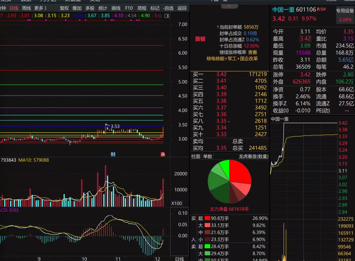 中国一重难得不涨,只是市值太大,能涨到哪个点位不去猜,关注3.08 3.15 3.23 3.44 3.67 3.85 4.10 4.54 4.90 哪里冲不过就在哪里抛,3.44正好是阻力若明天直接突破就更好