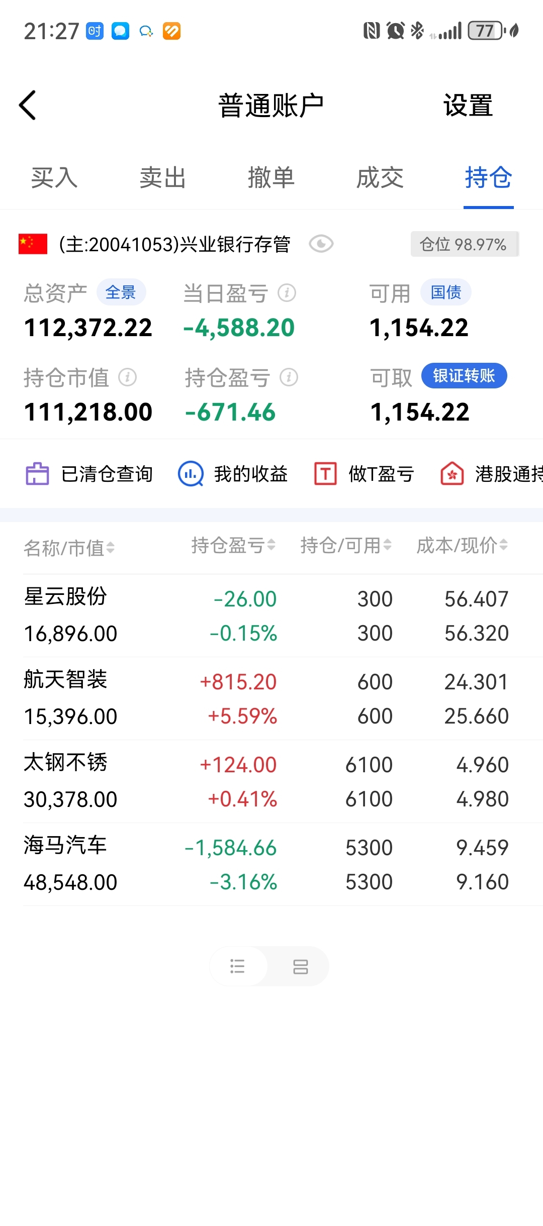 今作:出清中国一重,加仓海马汽车。亏损。持股待涨。