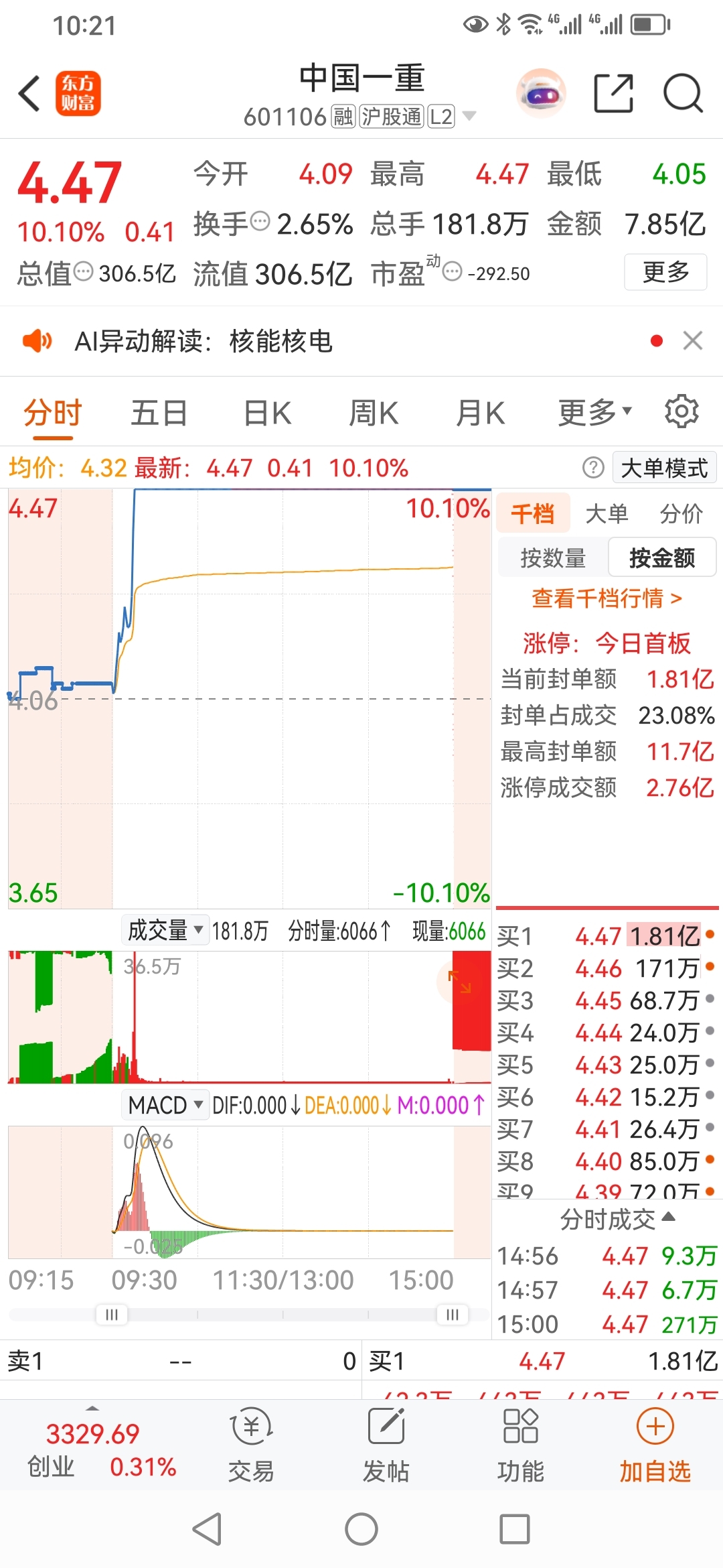 军哥,中国一重:净买入3000万;