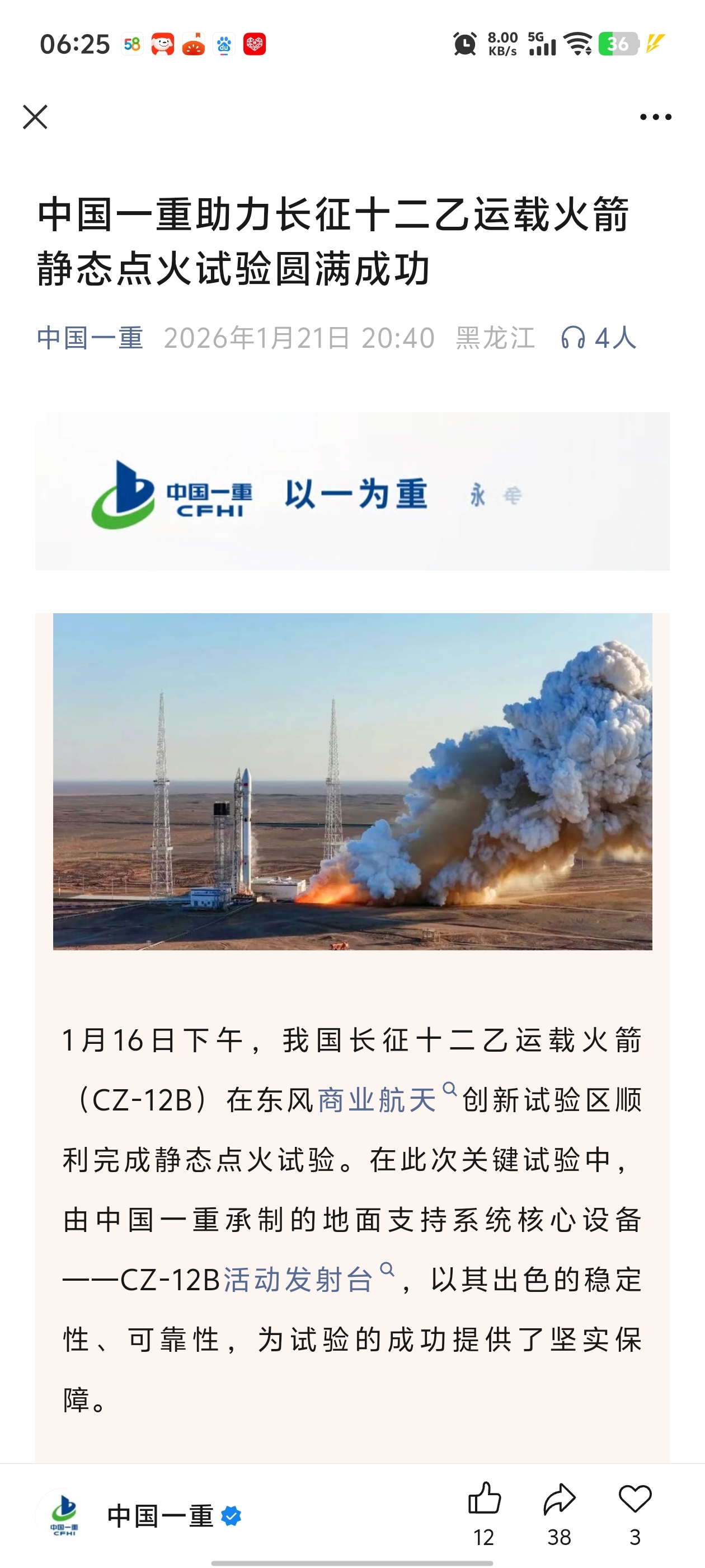 $中国一重(SH601106)$ 1月16日下午,我国长征十二乙运载火箭(CZ-12B)在东风商业航天创新试验区顺利完成静态点火试验。在此次关键试验中,由中国一重承制的地面支持系统核心设备——CZ-12B活动发射台,以其出色的稳定性、可靠性,为试验的成功提供了坚实保障。