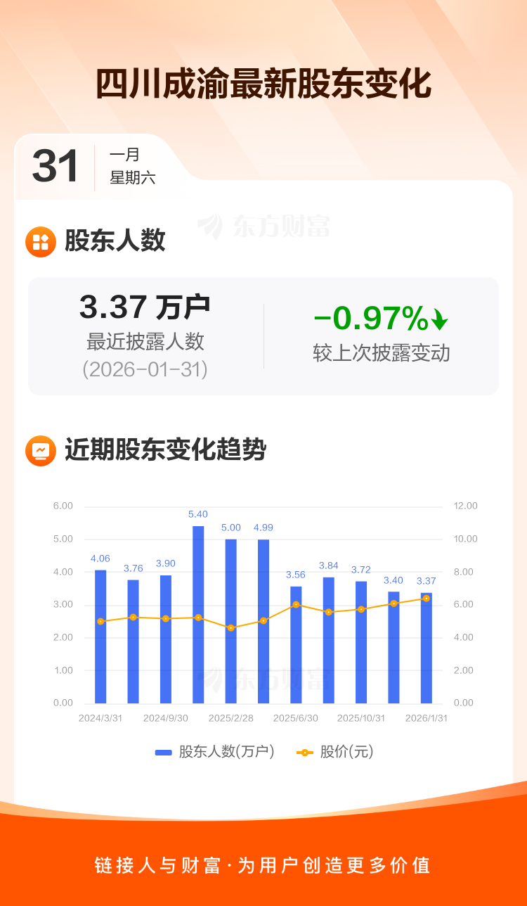 四川成渝:截至1月31日最新股东户数3.37万户,较上期减少0.97%