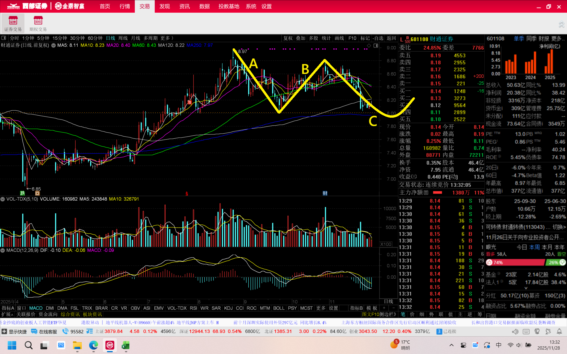 券商板块先于大盘调整,目前正在运行小C浪调整。。。近期有可能完成短线调整。。。券商板块12月大概率会出现反弹。。。。2026年1月中旬,年报业绩预告会大面积出现。