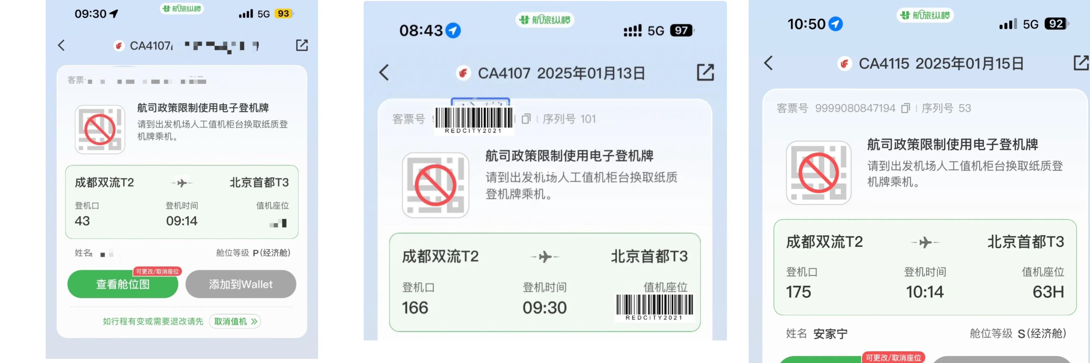 近日,有多名旅客在社交媒体反馈,乘坐国航CA4107、CA4115等成都双流飞往北京首都的航班时,无法在航旅纵横APP上使用电子登机牌乘机。根据这些旅客提供的截图,航旅纵横页面提示:“航司政策限制使用电子登机牌,请到出发机场人工值机柜台换取纸质登机牌乘机。”